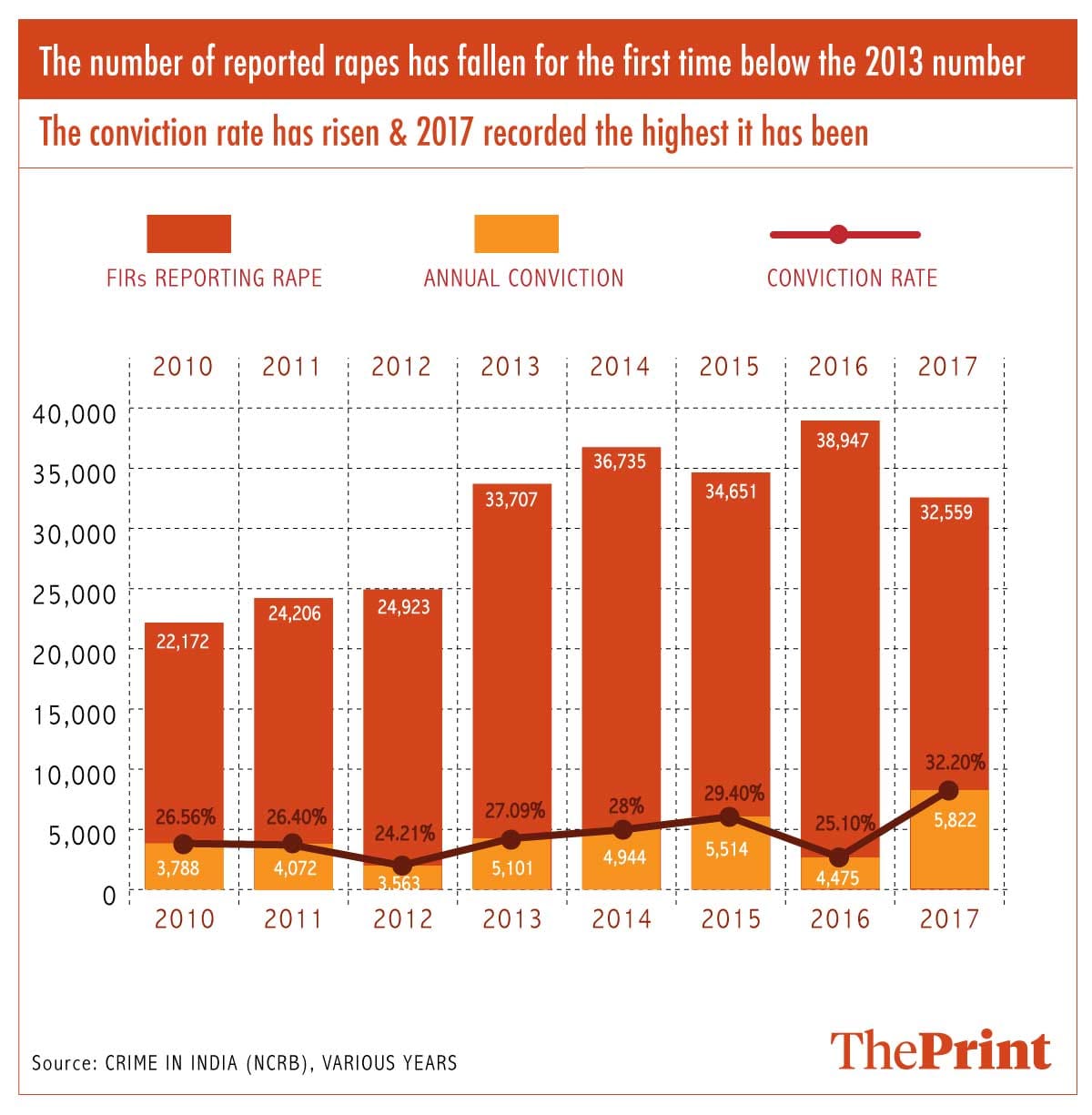 Trends over time help us in our understanding. In the last few years, an annual increase in the number of reported crimes against women has usually led to headlines like India is now ‘the world’s most dangerous country for women’. However, there is anecdotal evidence from grassroots women’s rights organisations that the national conversation around sexual violence after the tragic December 2012 Delhi gangrape and murder encouraged more women to report the crime. That boost, however, now appears to be tapering off. The number of rapes reported nationwide in 2017 has fallen below the elevated number reported in the aftermath of 2012. Simultaneously, the conviction rate has grown.