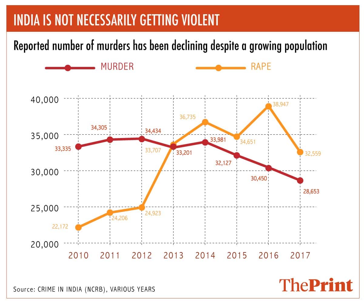 But another part of it is the nature of crime, policing and society itself in India. A First Information Report (FIR), the basic unit of the NCRB’s annual reports, signals much more than just that a possible crime has been committed. To some extent, it signals the victim’s willingness and ability to go to the police at all, indicating that an increase in reported crime does not necessarily mean an increase in crime; the expansion of all-women police stations, for instance, increased the rate of reporting of crimes against women by 22 per cent. But an FIR is also a reflection of morality and mores; one-third of the rape cases tried by Delhi’s district courts in 2015 were filed by parents opposed to consenting young couples.