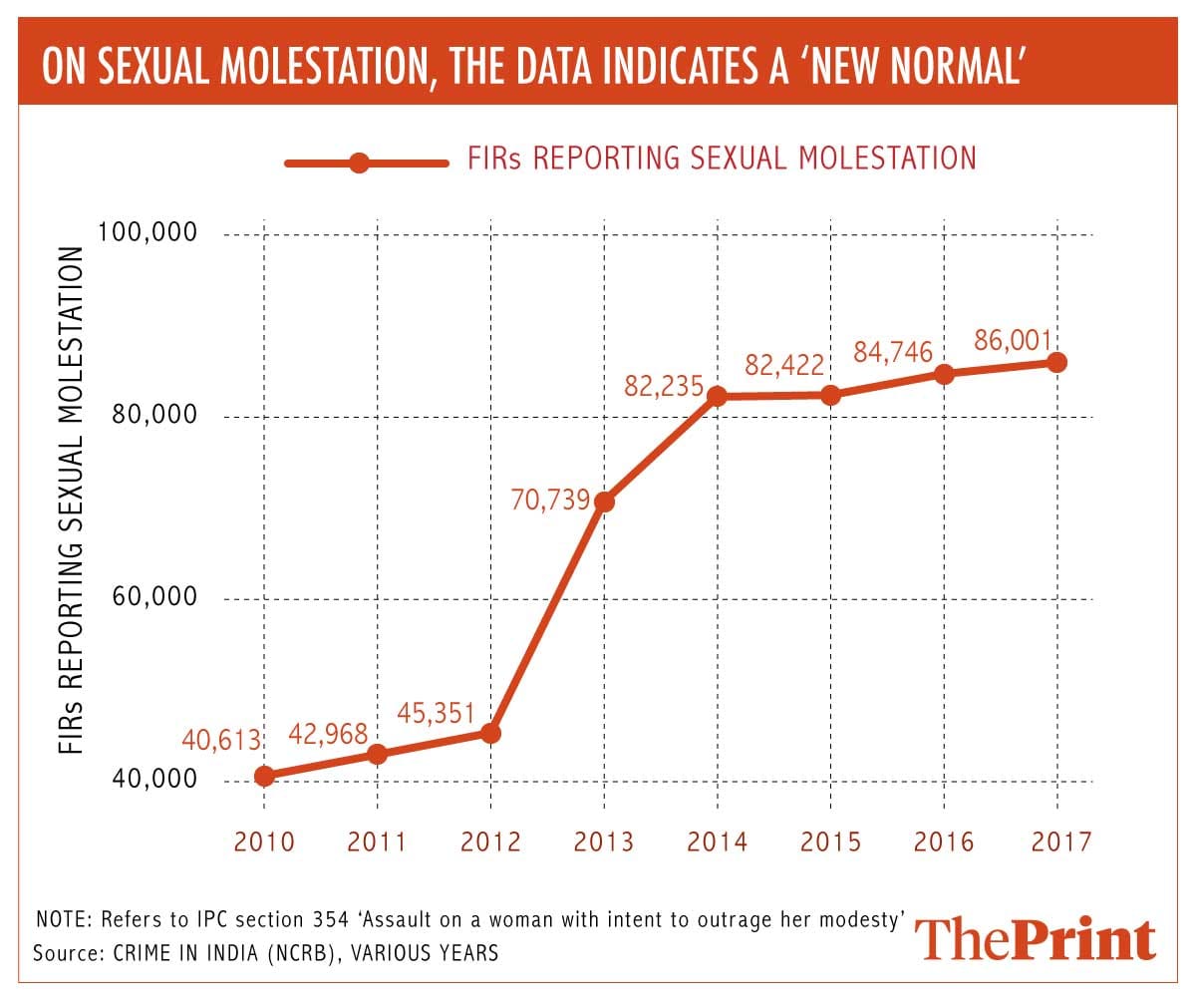 The brutal 2012 gangrape and murder also had a significant impact on less severe sexual crime; there was a record increase in the number of FIRs alleging sexual molestation in 2013. That number has remained as high, indicating that a “new normal” has now been discovered after decades of a suppressed number.