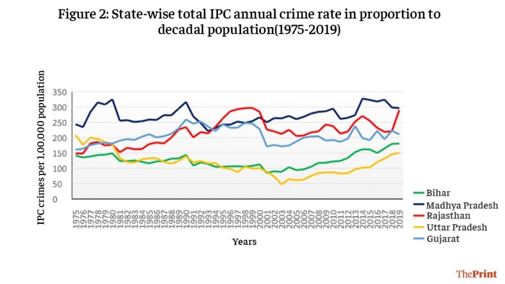 The NCRB data on cognisable IPC crimes for the last 45 years shows that crime counts (both in terms of absolute figures and in proportion to the population, as seen in Figures 1 and 2) was the lowest in Bihar among all Hindi-belt states. The analyses certainly include RJD’s ‘misrule’ phase, on which the entire Jungle Raj narrative had been premised. Even in comparison to Gujarat (taken as ideal in terms of investment climate, post-reform economic growth, and development), Bihar performed better and consistently registered lower crime counts.