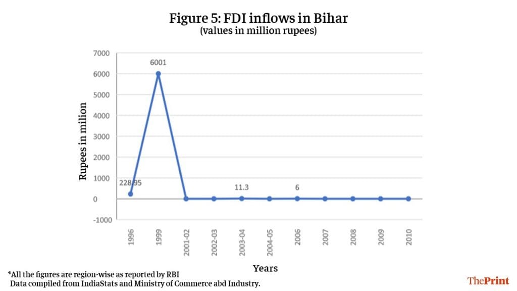 While the JD(U)-led governments failed to make any significant change, Nitish Kumar could also barely dispel the spectres of the Jungle Raj. This along with other structural variables in effect kept innovators, investors, industrialists, and capital away from the state and subdued Nitish Kumar’s development agenda. A review of the FDI (foreign direct investment) inflows in Bihar gives important insights on the issue (Figure 5). While FDIs depend on a host of factors, they are very sensitive to the prevalent socio-political environment at investment locations. Bihar received only a paltry amount as FDI when other Hindi-belt states (even with higher crime rates) kept receiving investments in varying amounts in the post-reform period.