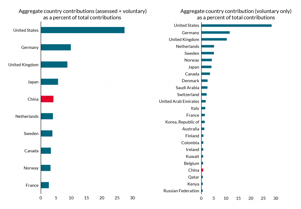 China is a top contributor to the UN’s development-focused entities, but this largely reflects its level of assessed contributions, which are based on economic size (Figure 5). For voluntary contributions, China ranks 22nd.