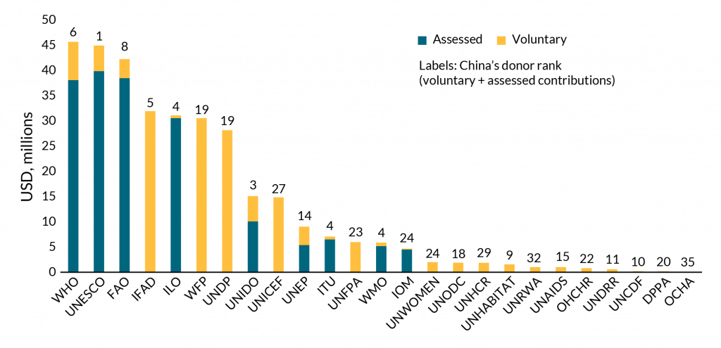 China’s largest contributions to the UN system (excluding its contributions to the regular budget and peacekeeping) go to the World Health Organization (WHO), UN Economic, Social and Cultural Organization (UNESCO), and the Food and Agriculture Organization (FAO). However, these are largely assessed contributions (Figure 6). China’s largest voluntary contributions, which are more indicative of China’s policy preferences, were made to the International Fund for Agricultural Development (IFAD), the World Food Programme (WFP), and the UN Development Programme (UNDP).