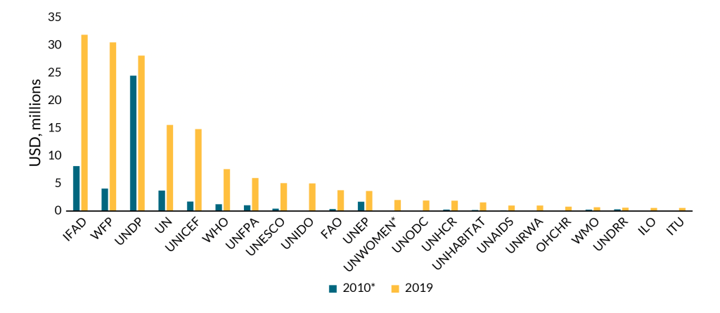 China’s voluntary funding of UN development-focused entities increased by 250% between 2010 and 2019. Particularly notable are the increases in China’s contributions to IFAD and WFP (Figure 7). This reflects Chinese policymakers’ recent focus on food and agriculture sectors’ role in development.