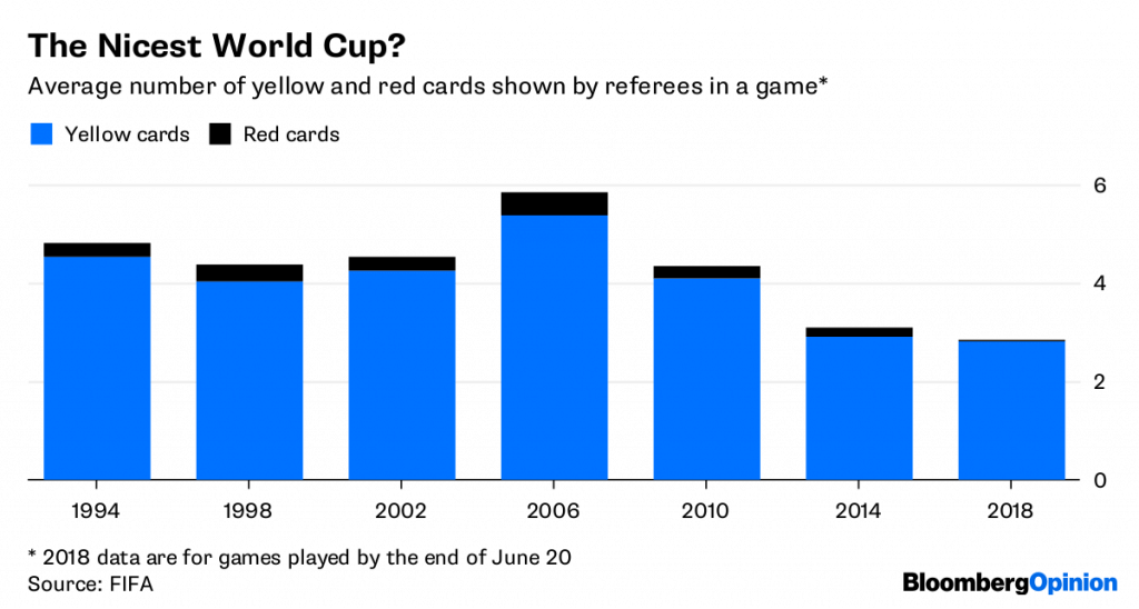 Anyone who has watched most of the games so far will have noticed that players spend less time simulating injuries than at previous World Cups, and that there’s surprisingly little dirty play (though the Brazilian star Neymar would probably object: In his team’s first game against Switzerland, he was fouled on 10 times, the most of any player in World Cup history). Nonetheless, yellow and red card statistics indicate that this may turn out to be the nicest World Cup in at least two decades.