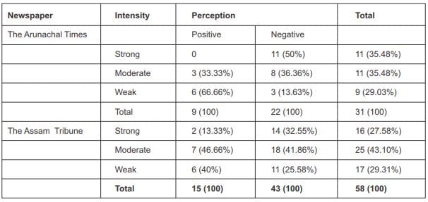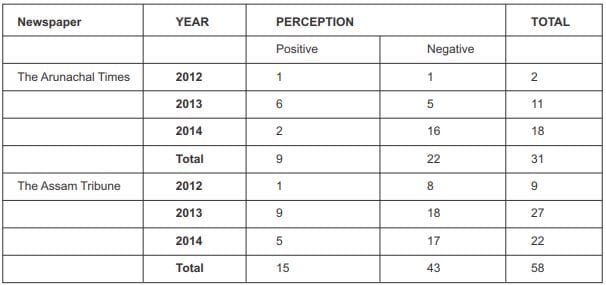 The authors conclude that regional perception, as projected by these two newspapers of the two states from the bordering region in India’s Northeast, differs sharply from the national-level perception. Perception from the bordering areas is distinctly more negative and has become increasingly so over the years compared to the perception projected by newspapers published from the national capital region.