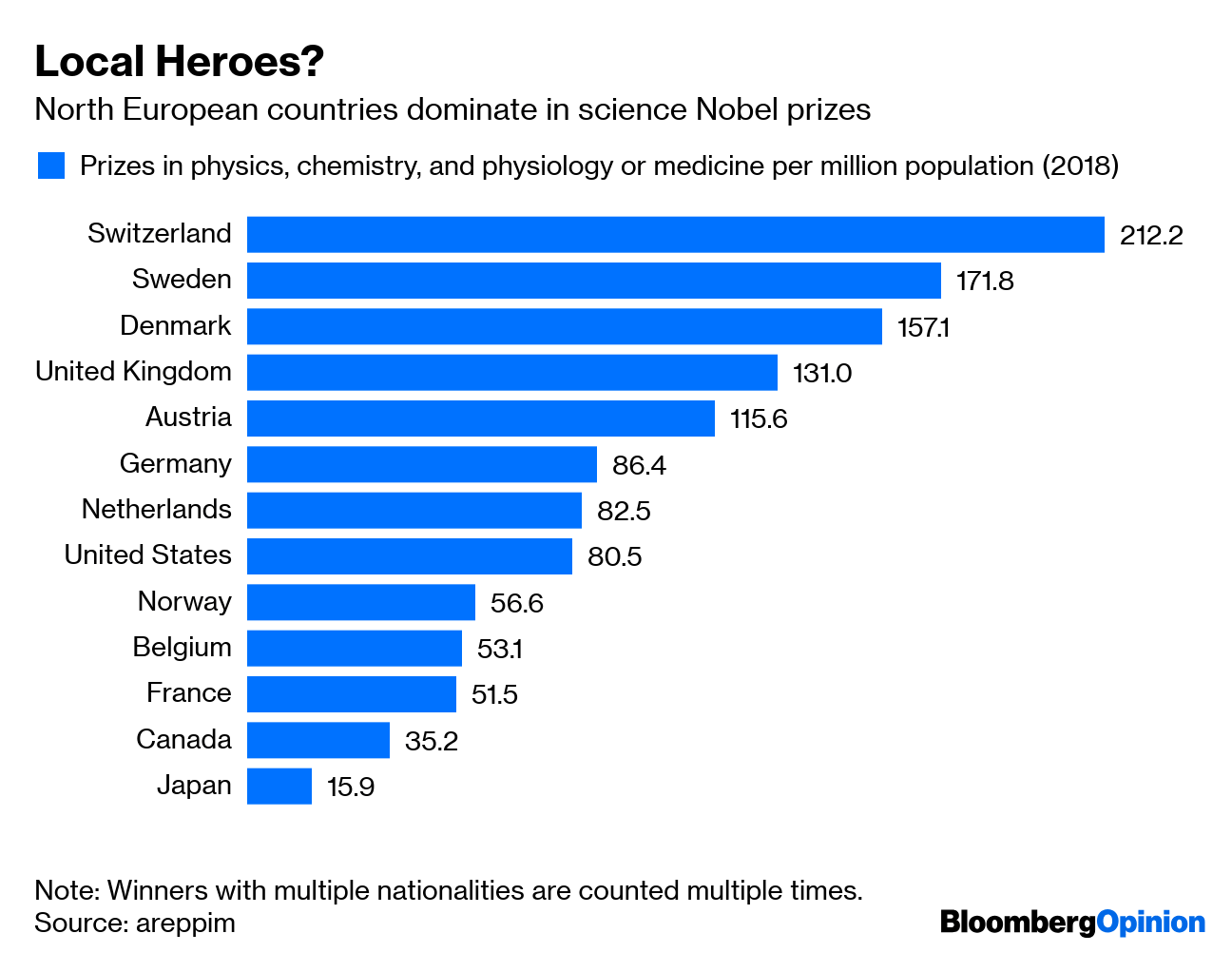 Perhaps countries like Denmark and Switzerland have more scientifically oriented cultures, or tend to spend their research dollars on university science instead of corporate research and development. But maybe it’s related to the fact that Swedish scientists award the Nobel prize. Though the Swedes try their best to be neutral and objective, they are more likely to be familiar with the work of scientists in their physical neighborhood, from conferences and seminars. They also tend to be fluent in English, which has become the international language of science publishing, while Japanese scientists have until very recently tended to publish in Japanese.