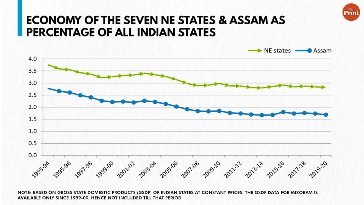 There has been some economic growth in the Northeast region, but it has not kept pace with the rest of India. This could be a cause for concern, for the road to lasting political stability in the region has to pass through economic prosperity. This is especially true for Assam, the most dominant state in the region, whose aggregate economy and per capita income seem to have failed to participate in the Indian growth story.
