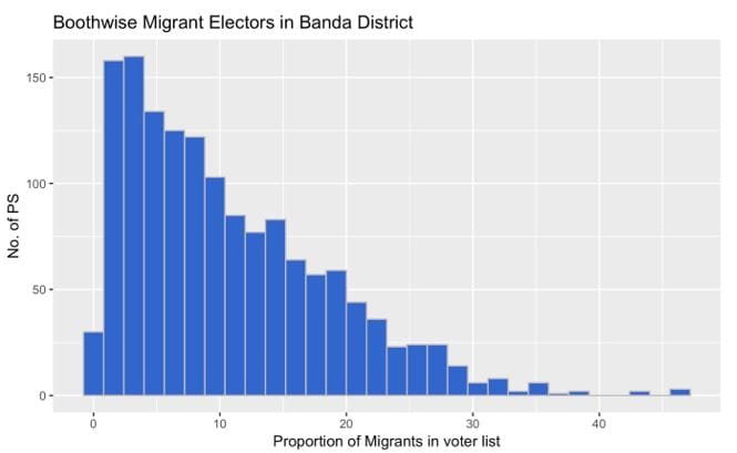 During our research in Banda, where there has been a substantial increase in turnout between 2014 and 2019 due to massive voter mobilisation by the district administration, we collected a baseline figure of migration across 1,454 polling stations. Figure 1 displays the migration rate and it is evident that many polling stations had more than one in every five registered voters not living in the area. We found that some migrants did return to vote, but their numbers were minuscule compared to the total number of migrants.