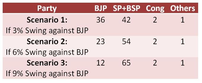 I reiterate, I am not making a forecast here. This is a very rough model. There are still many imponderables here. Can the SP-BSP alliance offer any real hope to the voters? Would the BJP succeed in communal polarisation?