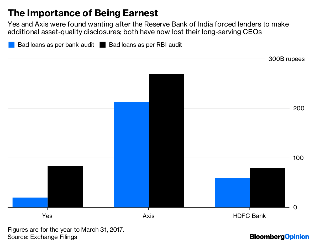 Kapoor earned the ire of the Reserve Bank of India by wrongly classifying loans he should have counted as nonperforming. Yes wasn’t the only bank to do this. RBI’s asset-quality reviews showed problems at Axis Bank Ltd. – and sure enough, the regulator refused to extend CEO Shikha Sharma’s reign, too. But while Sharma, who’ll leave at the end of the year, was a professional manager, Kapoor is a co-founder of Yes and a shareholder. The central bank wants him to step down after Jan. 31.