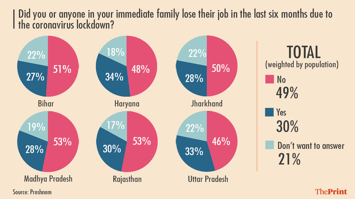 We were flooded with feedback and many researchers used the raw data of our survey to further extend the analysis of the impact of Covid-19. There were plenty of survey suggestions. (You too can write in with your suggestions to contact@prashnam.ai) Many asked us to probe further the impact of Covid-19 on livelihoods and enquire what people need from the government in these extraordinarily difficult times. We asked two questions to about 15,000 people in the same 967 rural constituencies as the previous survey across 229 districts in six states – Bihar, Haryana, Jharkhand, Madhya Pradesh, Rajasthan and Uttar Pradesh. As always, the sample was chosen using a scientific, randomised and stratified sampling technique.