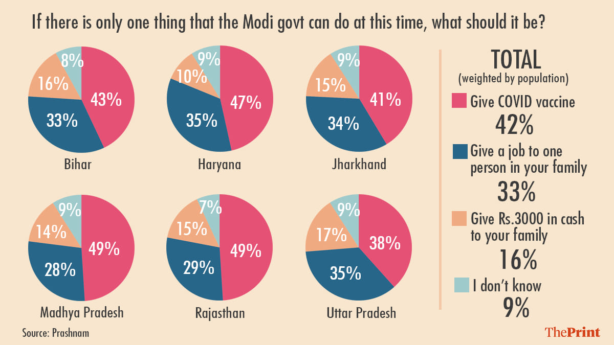 The survey clearly demonstrates the enormous tragedy in terms of lives and livelihoods that Covid-19 has inflicted on our nation. The high demand from the Modi government for vaccines is perhaps a sign that people want to get over this ordeal as soon as possible than be provided with economic relief. Of course, most people may want all (vaccine, job and cash) but since the survey forced people to rank these demands, vaccine comes out on top.