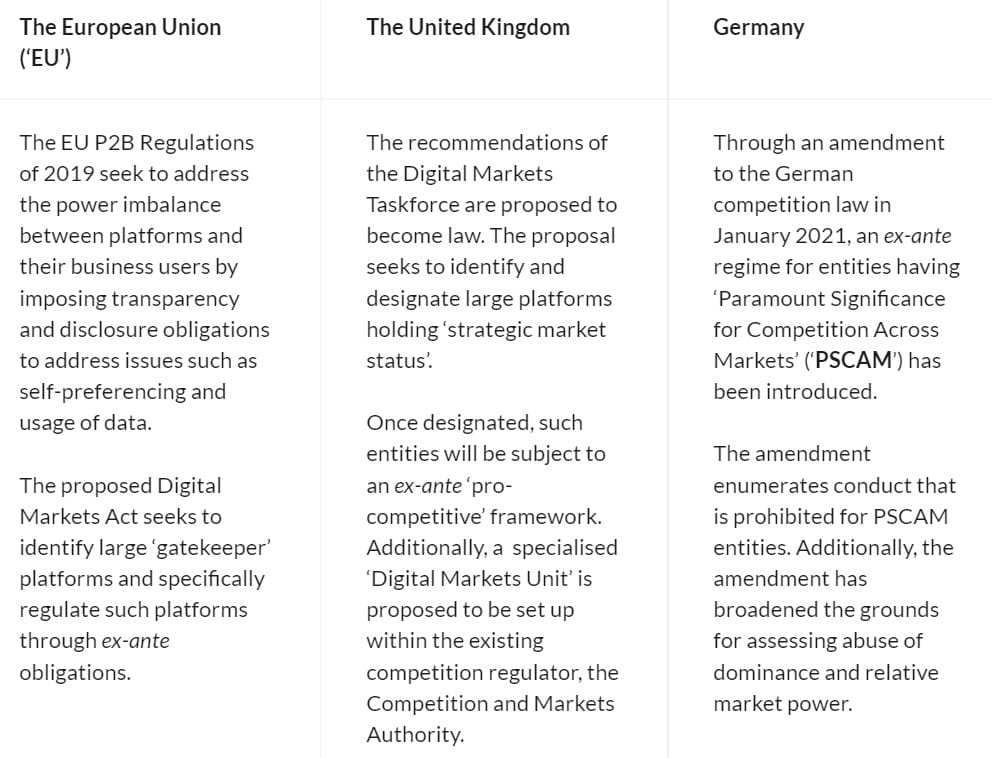 Similar regulatory trends aimed at strengthening ex-ante competition regulation with respect to platform giants may also be observed in Australia and China, where regulatory focus is on promoting transparency and addressing bargaining power imbalances between platform giants and their business users.