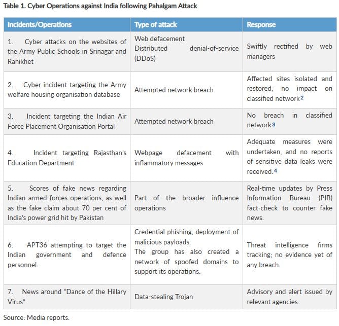 The ongoing cyberattacks targeting Indian infrastructure suggest growing reliance on cyber operations before, during, and after the cessation of military hostilities. Malicious actors were active as soon as reports of the Pahalgam attack surfaced, with a noticeable increase in their activities in the following days. Existing threat actors like APT36 created fake domains that mirrored legitimate services, which were used to deploy malware targeting the Indian government and defence personnel. Social media platforms were flooded with misinformation in a deliberate attempt to undermine public trust in Indian operations.