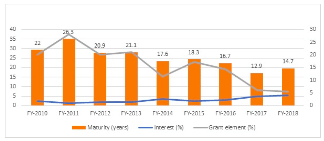 Figure 2 below shows that the debt maturity period had no particular trend from 2012-15 but started decreasing after 2015. It shows that Pakistan’s quality of debt deteriorated and became more short term post 2015, which is counter-intuitive. Similarly, the interest rate has been rising after 2015 after moving up and down from 2012-15. The grant component of foreign loans also decreased since 2015. This indicates that Pakistan is relying more on short-term high-interest loans, which are riskier.