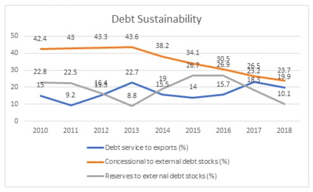 Similarly, as per Figure 3 below, Pakistan’s debt service to exports position and reserves to external debt stock position improved between 2013-15 as it had decreasing debt servicing obligations to exports and increasing forex reserves cover for that debt. After 2015, this started deteriorating. The percentage of concessional debt, which is generally preferred as it has low interest rates, has been going down since 2013.
