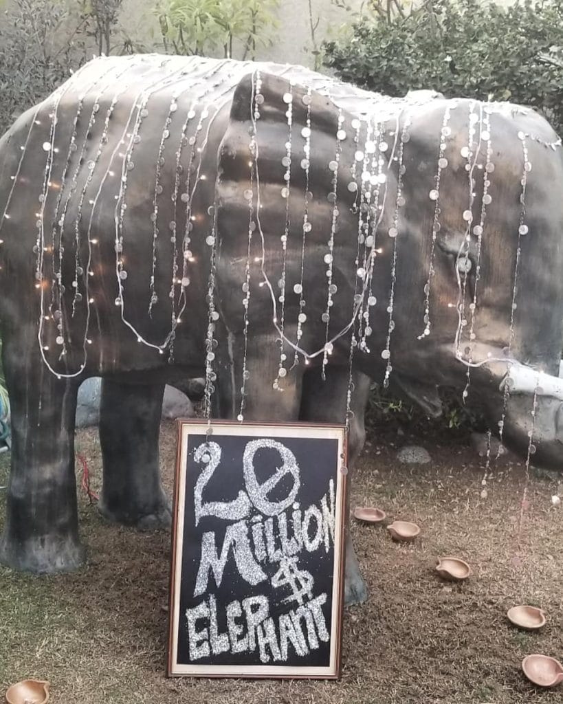 Grandiosity, bling and opulence were the dominant motifs of the party — white flowers, chandeliers and crystals. And from the mock Manish Malhotra pop-up store to vases encrusted with fake diamonds to sari-clad mannequins standing in as celebrity guests — it had it all. There was a fake-gold wall, orchids flown from Thailand, and a giant elephant with a sign saying ‘$20 million elephant’. There was even a gold cut-out of the name ‘Ambani’ near the drinks counter.