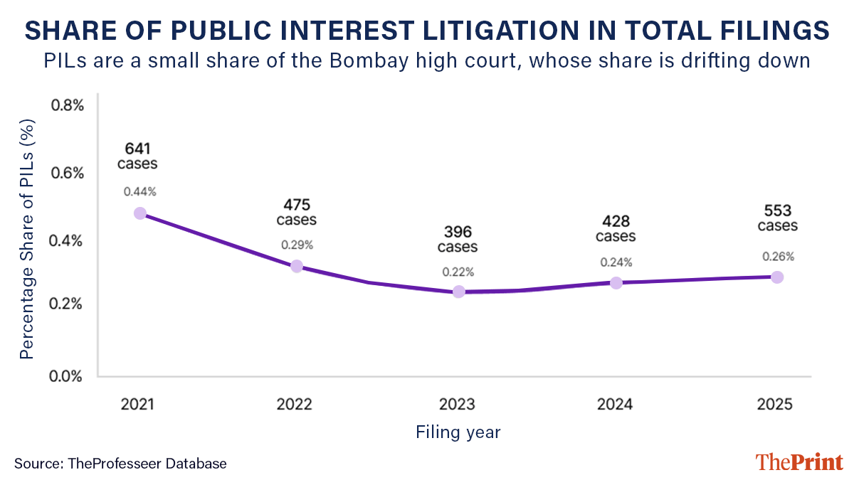 We learn that PILs have never exceeded half a per cent of the High Court’s annual docket in any year observed, and their share has, in fact, compressed. Whatever PILs do at the Bombay HC, numerically overloading the court is not one of them.