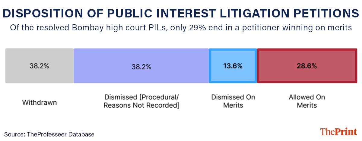 Of the 1,408 Bombay High Court PILs that have concluded, we find that petitioners win 29 per cent of the time. This is not a trivial figure. Even if PILs were nothing more than a pressure valve for civic grievance, the fact that 29 per cent of matters — cases raising substantial questions of justice and fundamental rights that would have otherwise found no institutional home — find relief says something meaningful about the instrument’s utility. Outcomes, in other words, are strong arguments about access.