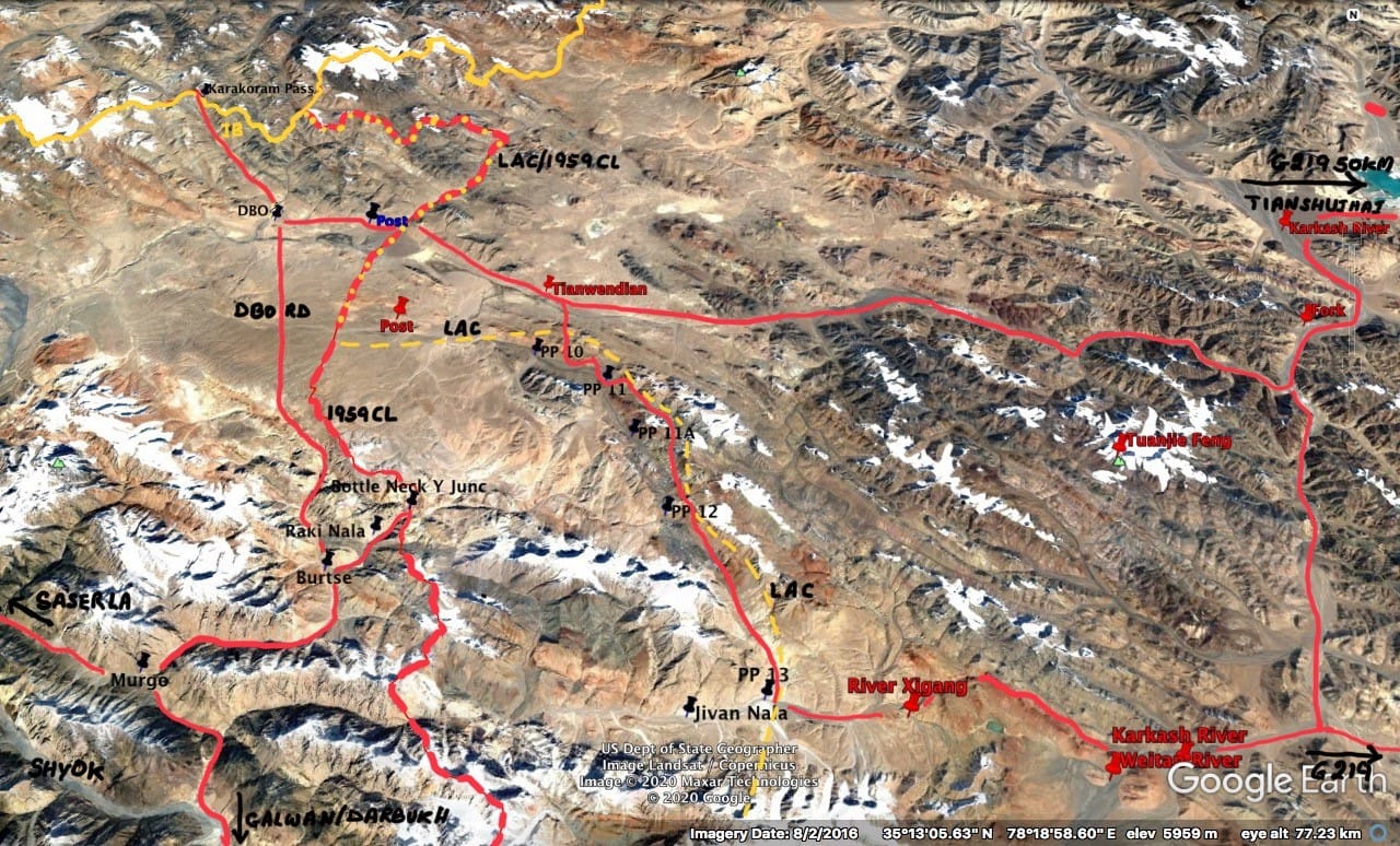 The 1959 Claim Line runs north to south from the Karakoram Range via Bottle Neck/Y Junction and further south to Jivan Nala. Prior to 1962, our posts were 5-10 km to the East of the Claim Line in the northern half of the plain, opposite DBO airfield. In the Southern half, these were 30-40 km east of Bottle Neck. In 1993, the LAC coincided with the 1959 Claim Line in the northern half of the plains, but East of the Bottle Neck, it was at 18-20 km. However, we never physically occupied the southern half of the plains and with a base at Burtse, the Indo Tibetan Border Police patrolled up to Patrolling Points 10, 11, 12 and 13.