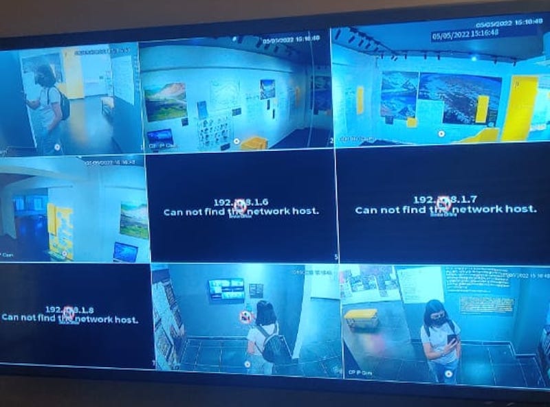 Right when you exit the Tibet Museum, comes an interactive shocker. You are projected across a row of nine security cameras.