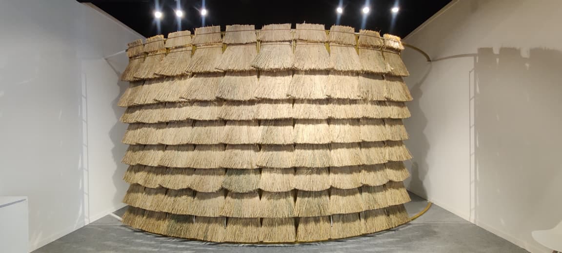 Against the bustle of the India Art Fair at Delhi’s NSIC Grounds in Okhla on a manic Friday afternoon, the stacked charpai installation under the blazing sun offered a disarming pause. While voices ricocheted between booths, collectors leaned into negotiations, and curators shepherded groups through the aisles amid the soft clinking of wine glasses, a scaffold of woven beds outside provided a break.