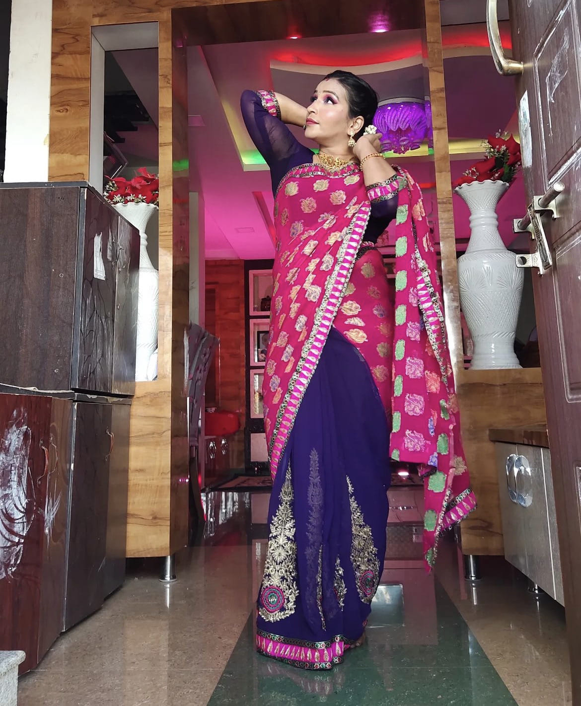 Her highest viewed reel at 23 million views is a transition video from her purple polka dot nightie to a pink saree set to the tune of the 90s hit Mr Boombastic.