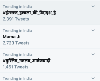 Such a biased article, the writer didn’t care to show the trends fired from the other side, she conveniently ignored it when there are several such tweets against Modi, RSS, BJP, Ramdev, Temples, etc daily sometimes tweeting over 100,000 tweets