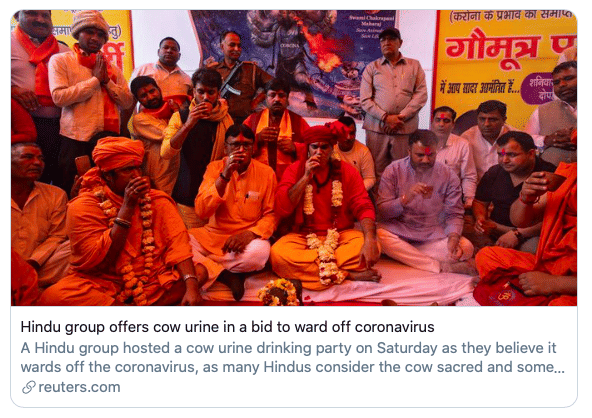 In February, when the whole world was figuring out ways to prepare for the coronavirus crisis, the BJP IT cell was busy telling people about the benefits of cow urine (gaumutra) and cow dung (gobar). WhatsApp groups were flooded with messages exhorting people to drink cow urine and lace their homes with cow dung; if they did that, the messages said, even coronavirus’ father wouldn’t dare come near them. Not only this, to make their propaganda seem credible and give it an Ayurvedic colour, they added basil and neem leaves. To attract the religious ones, a message was put out that if you light as many diyas as the number of sons you have, then the coronavirus will not come near you.