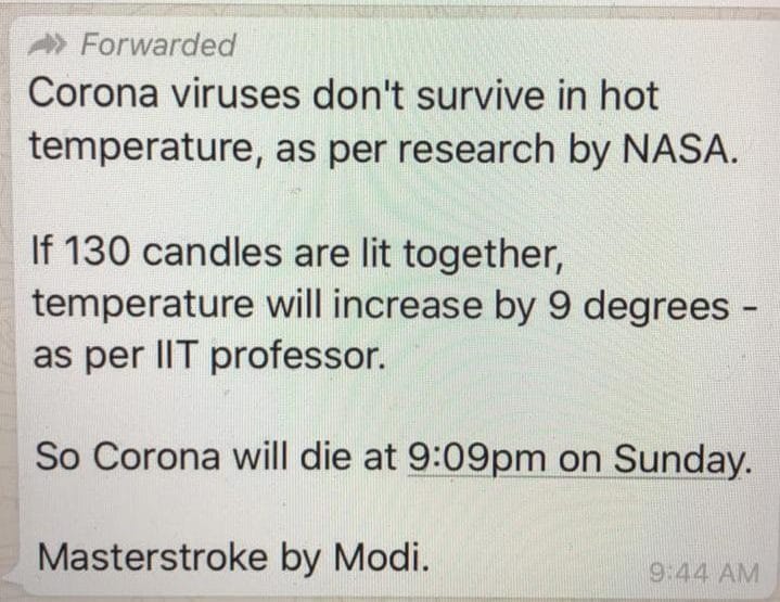 But it did not stop here. When Prime Minister Modi demanded a 14-hour Janata curfew and asked people to bang pots and pans, the IT cell spread the misinformation that the sound will dispel the threat of coronavirus. On Friday, when the PM asked the people to light diyas and candles “for nine minutes at 9 pm on Sunday”, the IT cell immediately started propagating the ‘scientific’ aspect of lighting diyas.