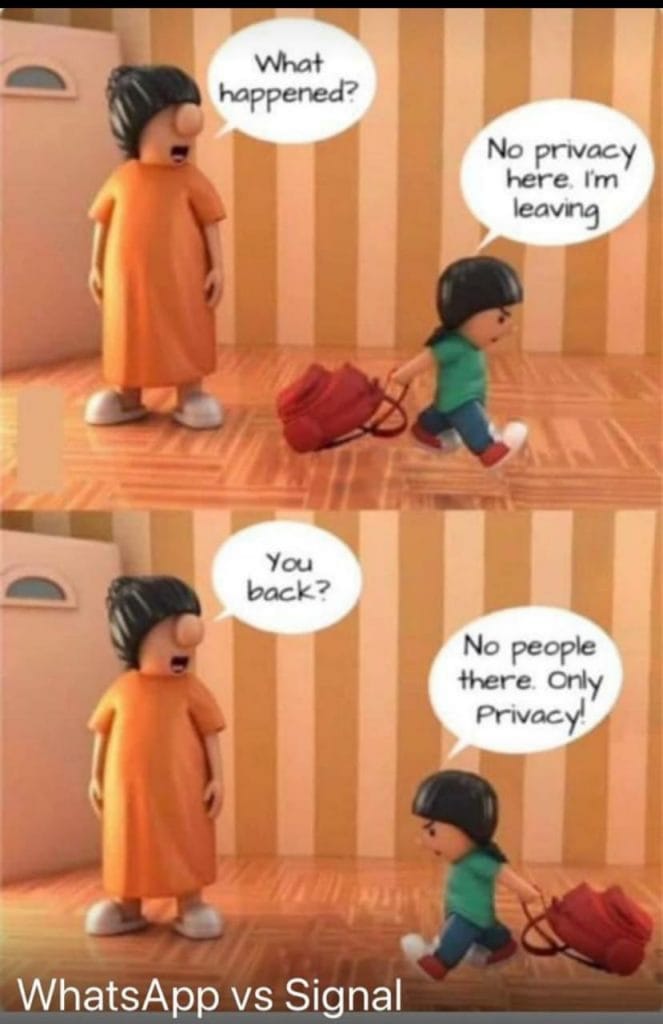 Batting for Whatsapp, The Print? Signal has gained at least 200 million users in just a week, numbers that would match the best signup weekly numbers for WhatsApp during its existence. I understand it could be difficult for the “uncles and aunties” at The Print to switch and co-ordinate a move to a newer and superior app (try a voice conversation on Signal and compare it with one on WhatsApp for quality, for one – every uncleji and auntyji will sound more natural) but privacy makes sense. It works even for the buzurg community who are heartened by contrived cartoons put up by Facebook / WhatsApp shills. Take it from an old man who’s been there, seen it, and who works for a technology licensing practice for a living.