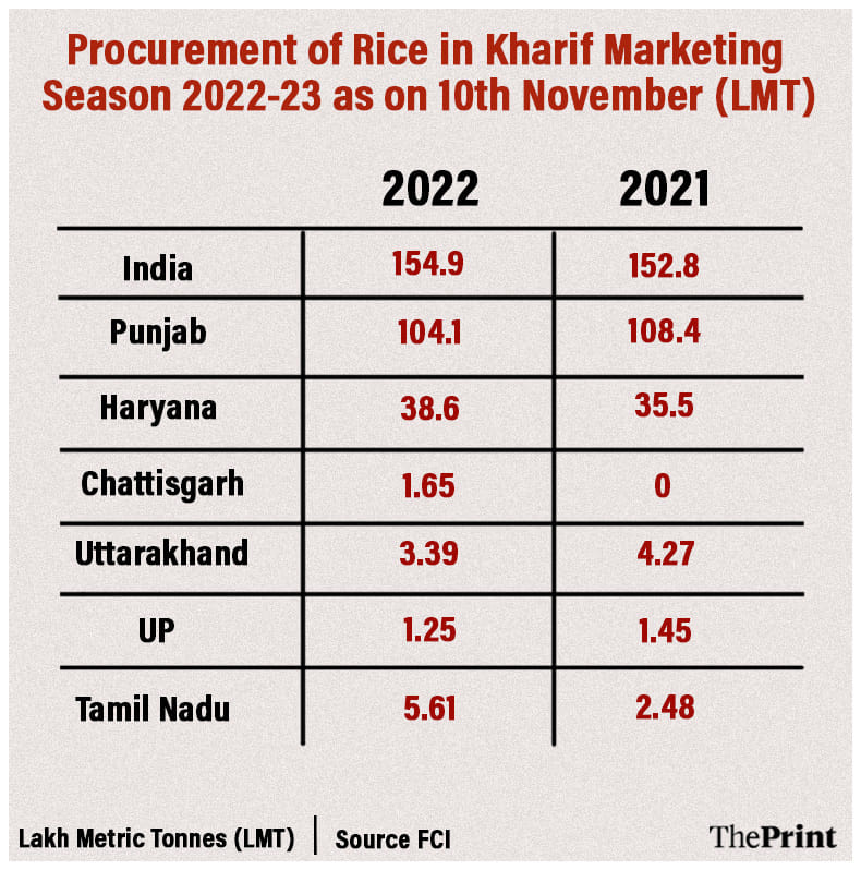 As of 10 November, Haryana has procured 38.6 LMT of rice this kharif Marketing Season against last year’s 35.5 LMT. Punjab has procured 104.1 LMT, which is about 4.3 LMT less than 108.4 LMT procured last year. Taken together, the two states account for 92 per cent of rice procured so far.