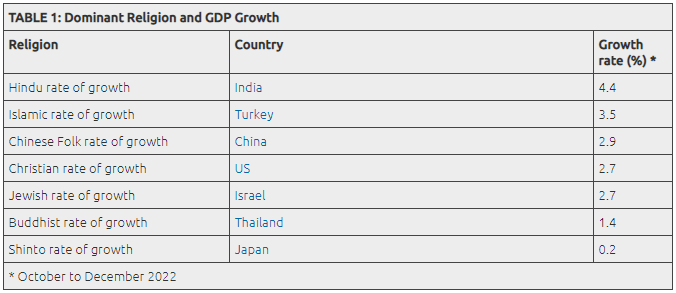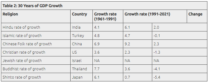Second, Rajan’s rant displays not merely a religious contempt of Hindus; he is equally an unthinking intellectual victim or a motivated accomplice of those narratives. His statement on the Hindu rate of growth is based on one—just one—quarter of GDP growth rate of 4.4 percent. On that count, Table 1 showcases the growth rates of countries where religions are in majority. This classification is based on the dominant religion in the country with the largest number of religious population of a significant size. Sadly for him, his narratives and his politics, the Hindu rate of growth comes on top. Instead of bemoaning the Hindu rate of growth, he should be advising other religions to convert to Hinduism.