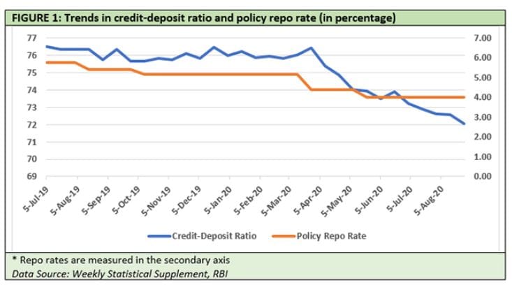 The credit-deposit ratio shows how much of each rupee of deposit is extended as actual credit disbursal. Broadly, this is one of the basic credit growth indicators. Though policy repo rate is continuously falling in the last few years, the credit-deposit ratio has remained constant and since April this year has plummeted during the pandemic (Figure 1). Though the cost of borrowing has consistently fallen down and more credit were made available to the economy, there were very few takers of such loans.