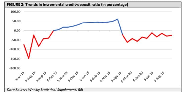 The slump in credit demand gets visibly prominent if we look at the trends in incremental credit-deposit ratio. As the name suggests, this ratio shows how much of new deposits are extended as new credit in the economy. This ratio was in the negative territory in the period between July and September last year, it slowly revived to a level of around 60% in March 2020, and slumped thereafter to get into the negative zone once again (Figure 2). To provide a contrast, the value of this ratio was 169.70% on 21 December 2018, 126.29% on 18 January 2019, and 116.01% on 15 March 2019.