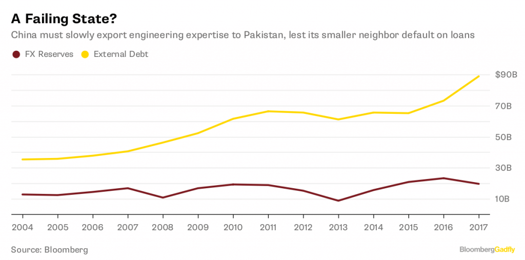 If China floods its neighbor with imports, Pakistan might default on one of its loans. External debt soared to almost $90 billion by the end of 2017, against just $11.4 billion in foreign-exchange reserves. Adding China’s $62 billion investment pledge, Pakistan’s debt burden would almost double. (The News reported Monday in Pakistan that the government may seek $2 to $3 billion as deposits from China, and might raise another $2.5 billion through a global bond.)