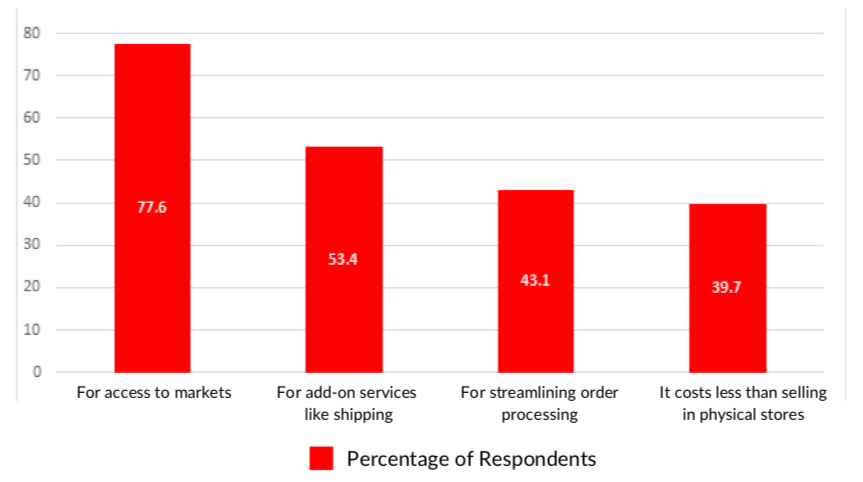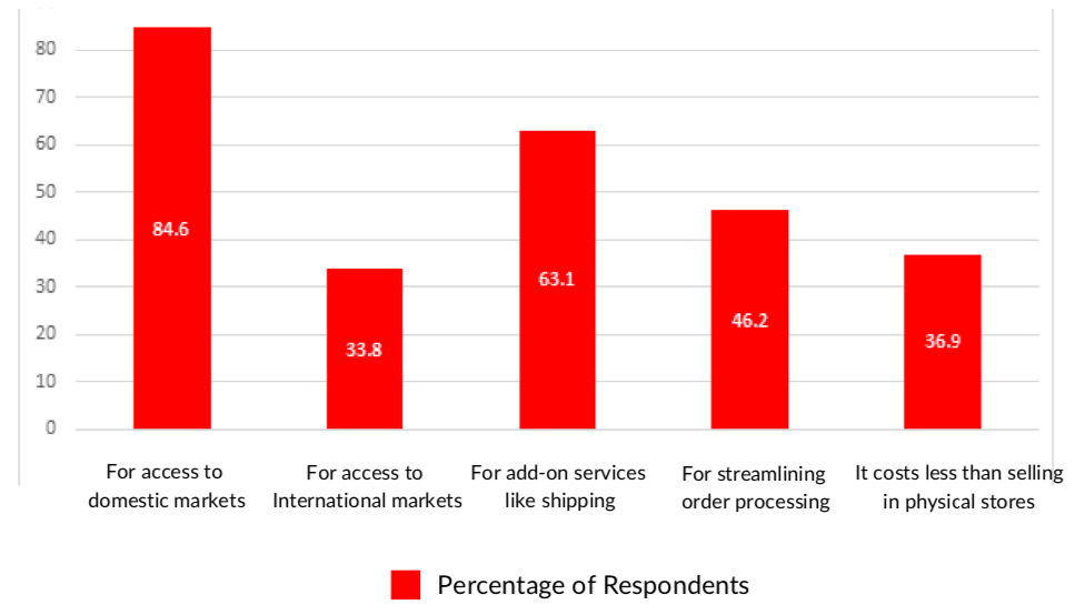 E-commerce adds value to third-party sellers’ business by providing access to new domestic markets (84.6% of Amazon sellers, 77.6% of Flipkart sellers) and improving price discovery (67.7% of Amazon sellers, 58.6% of Flipkart sellers changed their price after going online). It adds value to consumers with helpful product reviews (70% of consumers), lower prices (79% of consumers), and brand discovery (70% of consumers).