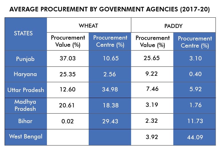 The protest is intense in states where the value of procurement is higher, and not necessarily in states that have more procurement centres. While more than 60 per cent of the procurement (in terms of value) of wheat takes place in Punjab and Haryana, only 13 per cent procurement centres are from these two states. Bihar, where the APMC Act was repealed in 2006, still accounts for 30 per cent procurement centres, with a miniscule 0.02 per cent procurement, making these centres economically unimportant for the farmers.