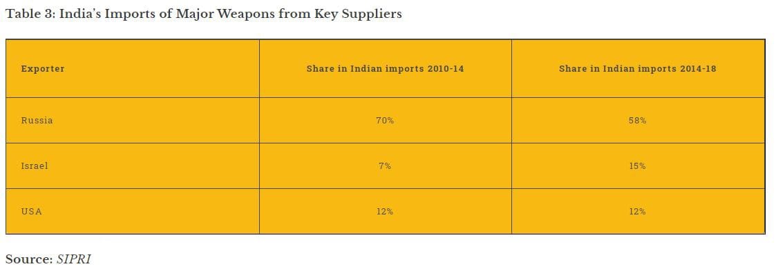 This does not mean that India only sources its arms import needs from Russia. SIPRI data suggests that while Russia supplied 58 percent of total arms imports by India in 2014-18, this was a step down as compared to 76 percent in 2009-13.