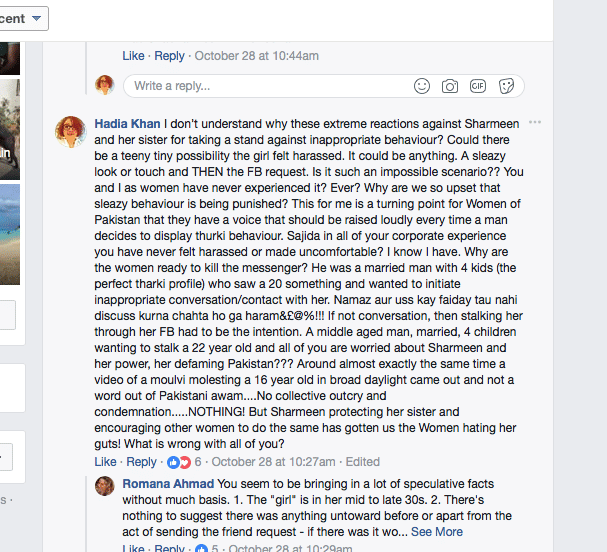 I was soon inundated with remarks like: “use your brain”, “poor man was the father of four”, “she used her family name”, “she boasted of her family’s influence”, “she gets paid to malign Pakistan”, “typical elite”, “she has ruined choices for women who are actually harassed”, and my favorite, “She is SOC, a public figure, she should have chosen her words wisely”!