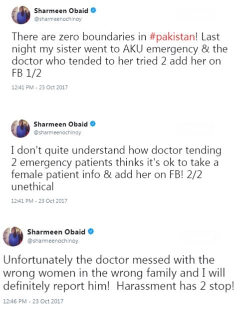Filmmaker Sharmeen Obaid-Chinoy, who has won two Oscars and an Emmy, said a Karachi hospital doctor harassed her sister on Facebook, but was called several names for it.