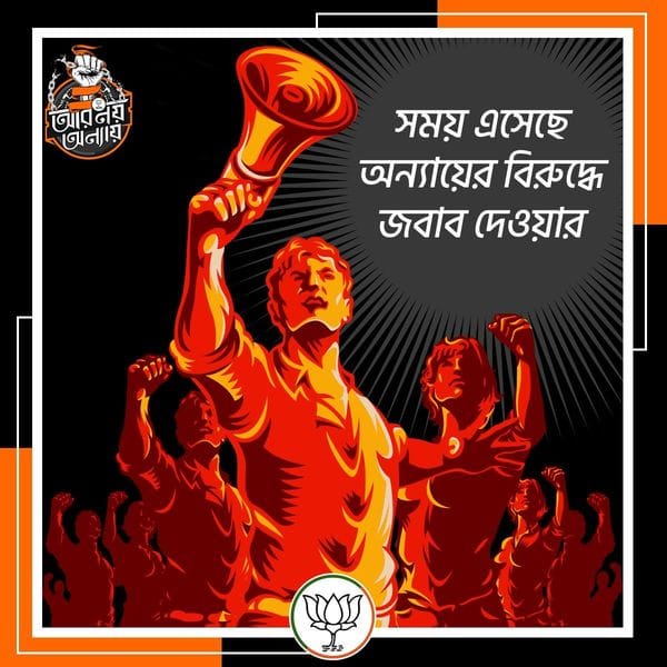 ‘Aar Noi Onnay’ translated as ‘No more injustice’, which is BJP’s official slogan for the upcoming assembly election, has interestingly used the image of hands breaking free from shackles with two men (in typical Leftist representation of the working-class body) supporting it (Image 1). Its official Facebook page ‘BJP West Bengal’ is also constantly circulating images that until now have been associated with Left-wing politics in West Bengal (Images 2, 3, and 4).