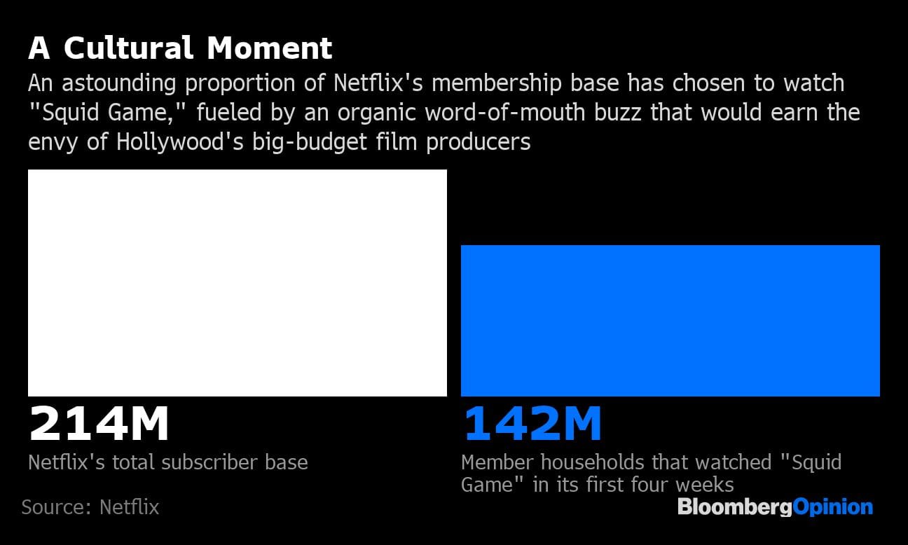 In mid-September, just before the quarter ended, Netflix released a Korean-language series featuring no globally recognizable actors and a violently dystopian storyline that was turned down by studios for years because it seemed too grotesque. And yet the enticement of a bizarre plot, mysterious title and hefty degree of FOMO has fueled “Squid Game” curiosity around the world, making it Netflix’s biggest series ever.