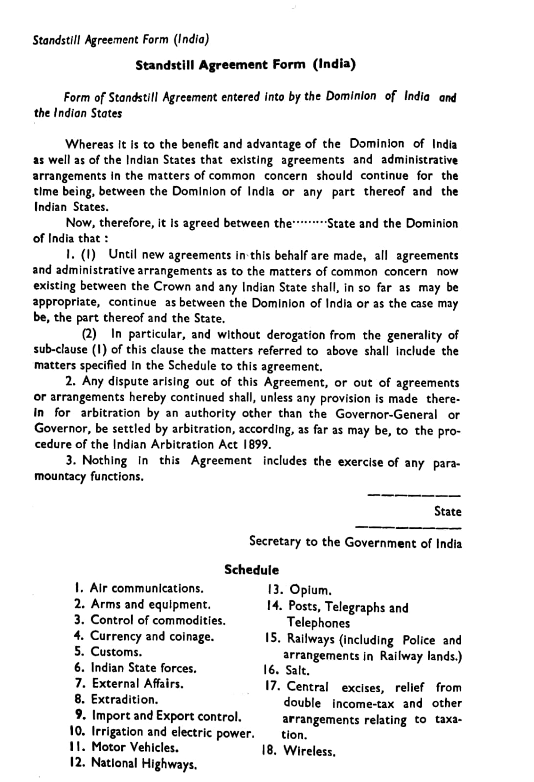 The finalised format of the formal Standstill Agreement (used by India) provided for the continuance of existing arrangement that is, maintenance of status quo on matters specified in the schedule, and expressly provided for arbitration in case of any dispute. Clause 2 of the Standstill Agreement stated: “Any dispute arising out of this Agreement, or out of agreements or arrangements hereby continued shall, unless any provision is made therein for arbitration by an authority other than the Governor-General or Governor, be settled by arbitration, according, as far as may be to the procedure of the Indian Arbitration Act 1889.”