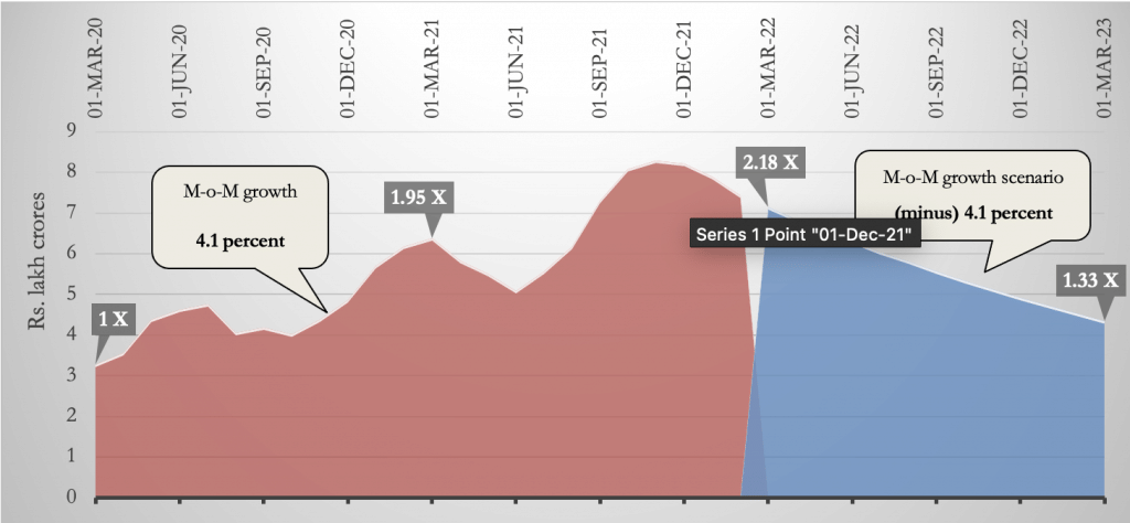 Since mid-2019, India has had surplus liquidity that only grew over the course of the pandemic due to the Reserve Bank of India’s (RBI) actions. Outstanding liquidity injection in the economy increased by nearly 4.1 per cent month-on-month over the last two years, which led to excess outstanding liquidity of Rs 7.44 lakh crore (on a three-month moving average basis). Such growth in liquidity is unprecedented. As a plausible future scenario, it may be worthwhile to consider if the RBI withdraws liquidity at the same rate. Over Rs 4.3 lakh crore excess liquidity will remain in the economy — nearly 33 per cent higher than that in March 2020.