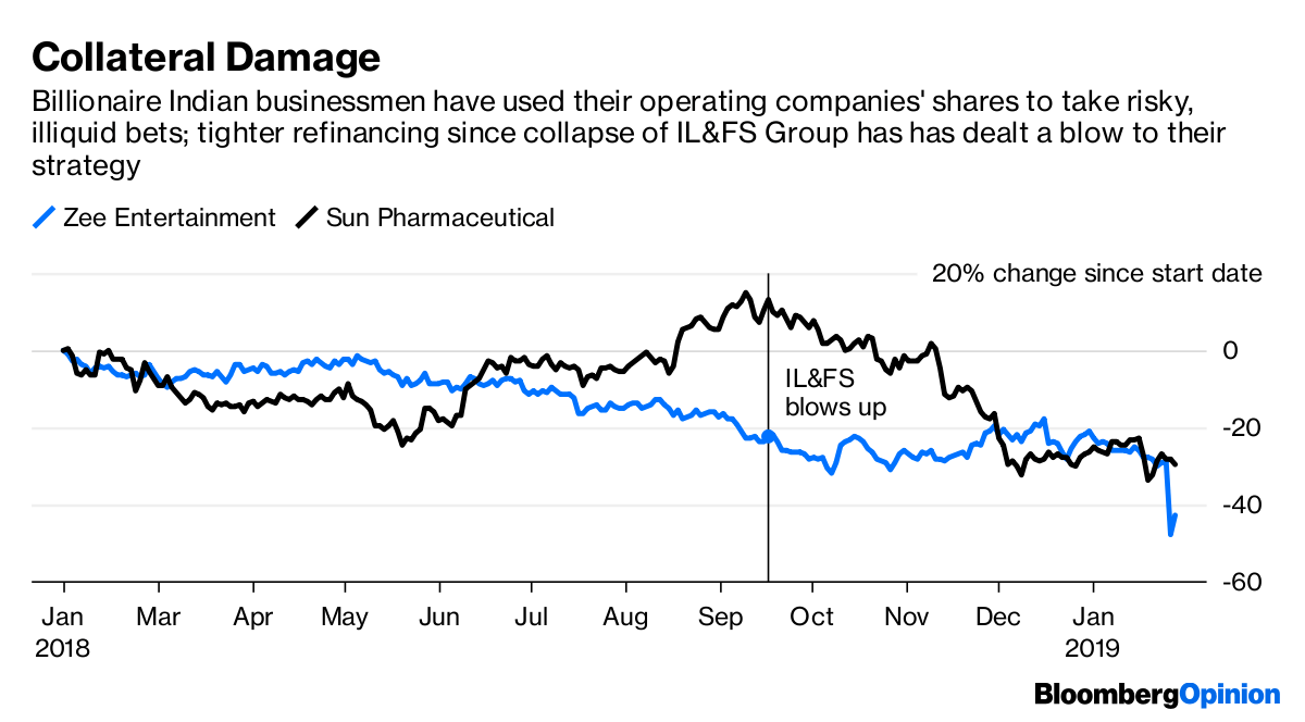 The collapse of IL&FS found a mention in Chandra’s mea culpa. The implosion of the highly rated lender raised financing costs for everyone who had borrowed short-term funds to invest in long-term assets such as roads, power stations, waste-management plants, or in the case of drugmaker Sun Pharmaceutical Industries Ltd.’s billionaire founder Dilip Shanghvi, apartment complexes and windmills. The collateral for these forays in most instances was shares of their successful, publicly traded operating companies.