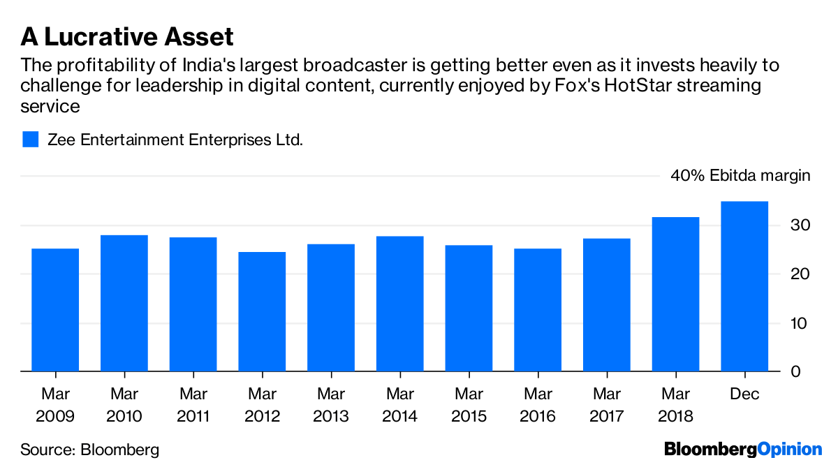 Zee, where I worked briefly in the 1990s, is a content powerhouse with a 20 percent share of India’s traditional television viewing market. The network also boasts 35 percent Ebitda margins despite heavy investment in Zee5, a fast-growing digital app. There’s no confirmed bidder yet, but according to a report in the Business Standard, Zee may be of interest to Amazon, Apple Inc., Tencent Holdings Ltd., AT&T Inc., Singapore Telecommunications Ltd., Comcast Corp. and Sony Pictures Entertainment Inc.