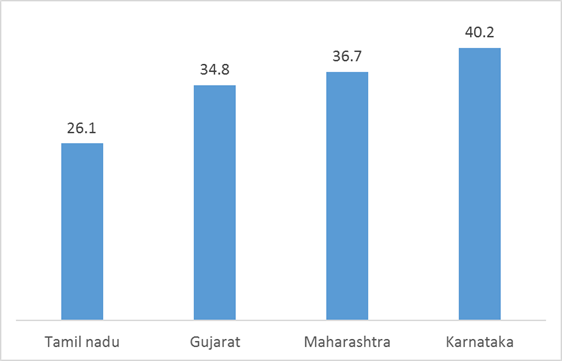 To test this in our ongoing research work, using unit-level data from NFHS, 2015-16, we construct a welfare index as an equally-weighted average of three sub-indices – 1) Consumer durables index (taking into account possession of 20 different consumer durables including television, refrigerator, computer and vehicles; 2) Basic services index (piped water supply, toilet facility etc.); and 3) Housing quality index (type of house, number of rooms etc.). We then take the all-India median value of these indices and check the percentage of households in a state that lies below this median value. Among its peer group, Tamil Nadu has the lowest percentage of population below the median value of the all-India welfare index (Graph 1).