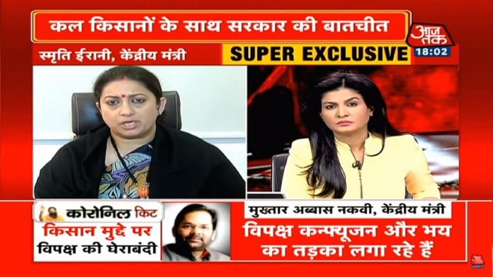Republic TV’s Arnab Goswami made up words as he raved against the Opposition for “parasiting on the farmers” and pivoting “180 degrees” on their own statements. Sreenivasan Jain wondered if there was a “sense of opportunism” about the Congress’ support for the farmers (NDTV 24×7) and Rajat Sharma said the Opposition had parachuted into the agitation (India News).